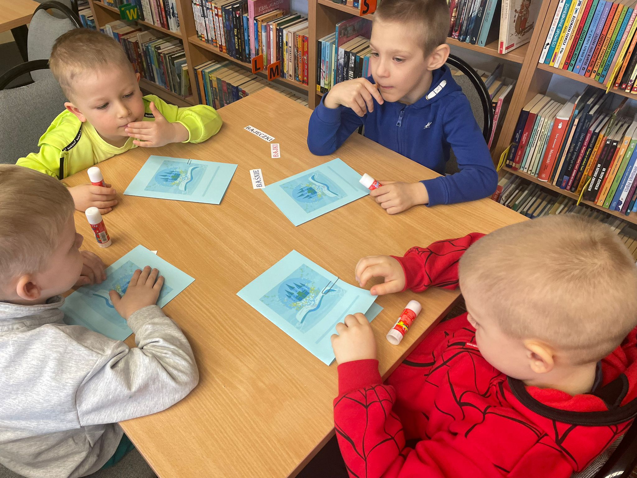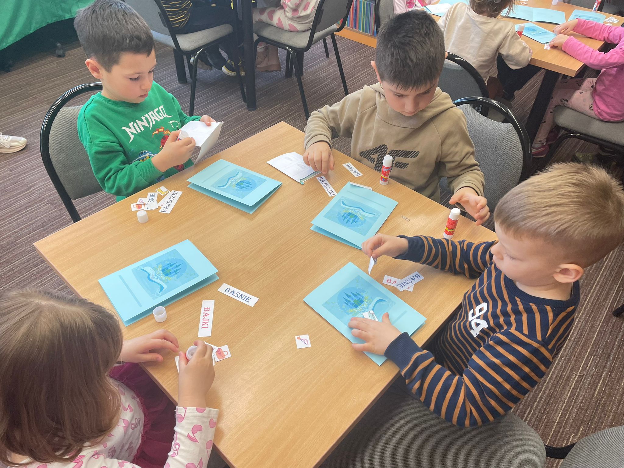 Maluchy wykazały się imponującą wiedzą na temat bajek i baśni – bezbłędnie odgadywały zagadki oraz wykonywały zadania związane z ich tytułami. Na zakończenie każde dziecko stworzyło swoją własną „mini książkę” 📖✨