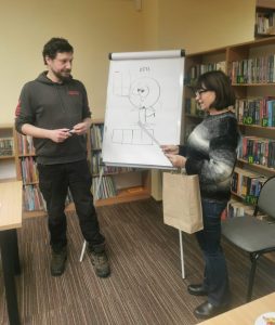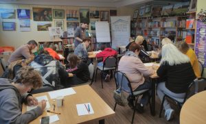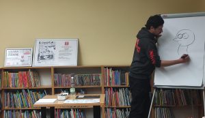 Uczestnicy konsultowali swoje prace, wymieniali się pomysłami i doskonalili swoje plansze komiksowe o Dywitach tworzone po drugim spotkaniu.