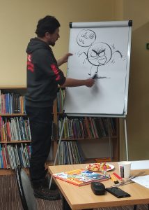 Zajęcia miały zarówno charakter edukacyjny, jak i twórczy. Prowadzący dzielił się praktycznymi wskazówkami i kulisami swojej pracy, podkreślając rolę wyobraźni oraz dbałości o detal. Uczestnicy wyszli ze spotkania z pierwszymi szkicami własnych bohaterów i głowami pełnymi nowych pomysłów.