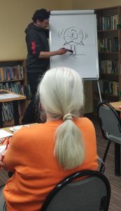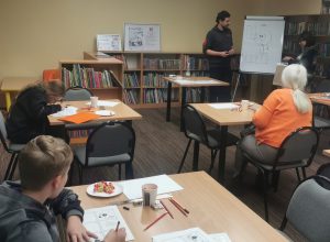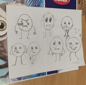 - rysowaniem postaci i oddawaniem ich emocji – różnorodność pokoleń obecnych na warsztatach sprawiła, że interpretacje emocji i pomysłów były wyjątkowo ciekawe;